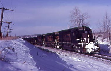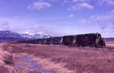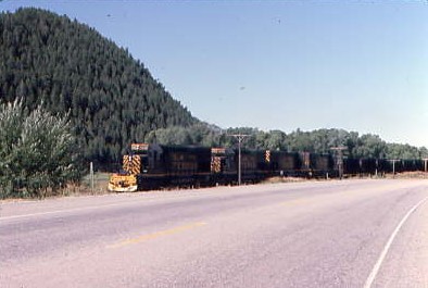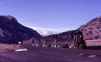 12/19/1983 -- North of Salida, we caught Denver and Rio Grande Western 5351 East with four Missouri Pacific SD40-2's in the consist.