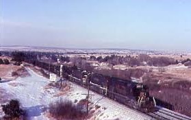 12/21/1983 -- Denver and Rio Grande Western 5392 East showed up and after a picture at Palmer Lake, we went towards Monument, Colorado catching him curving onto the railroad overpass across the highway.