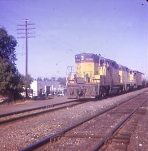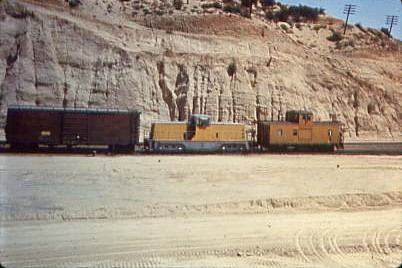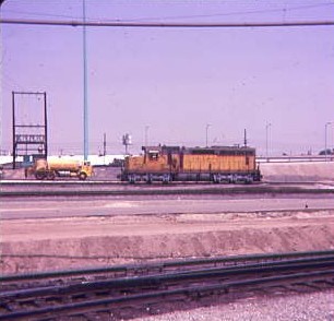 1975 -- Union Pacific SD24 411, built by Electro-Motive Division in 1959 and retired in 1977, making its way east through Colton. It was sold to Precision National Corporation in October 1977 then sold to Illinois Central Gulf and rebuilt as Illinois Central Gulf SD20 2010 in February 1980, then Illinois Central 2010. It was then sold to National Railway Equipment in February 1995, became Indiana Harbor Belt 2921 in 1996 and Cargill Incorporated 605 in 2016.