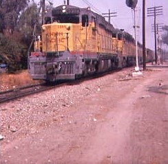 January 1976 -- Union Pacific SD24B 402B, built by Electro-Motive Division in 1959, coming onto the joint Santa Fe trackage at Riverside Junction. It was retired in 1977 and sold to Precision National Corporation.