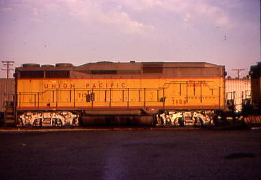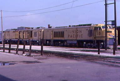 July 1982 -- In the dead line at Cheyenne, Wyoming during the national railroad strike was Union Pacific gas turbine electric locomotive 18, built by General Electric in 1960 and retired in 1970. An example of the most powerful locomotive ever built in America, it was rated at 10,000hp and consisted of the cab unit; the main power unit containing a turbine engine, similar to a jet engine, numbered 18B; and a tender to carry fuel for the turbine. The railroad designed these locomotives specifically to pull freight trains between Omaha, Nebraska and Ogden, Utah and 18 is one of only two in preservation. Their poor fuel economy and high maintenance costs of the turbine led to their retirement in the late 1960s.