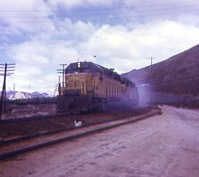 March 1974 -- Union Pacific GP20 484, built by Electro-Motive Division in 1960, retired in 1980 and sold to Precision National, on its way around Sullivan's Curve.