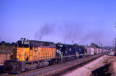 1979 -- Union Pacific SD40 3015, nee Chicago and North Western 6880, built by Electro-Motive Division in 1974 and retired in 2001, led two two Missouri Pacific SD40-2's westbound through Streeter Avenue in Riverside.