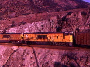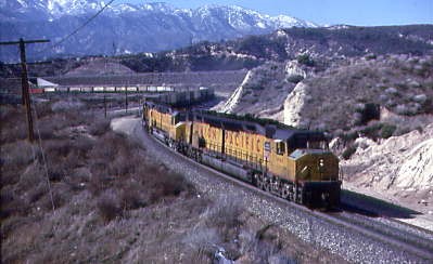 March 1974 -- Just after sunrise, Union Pacific U50C 5021, built by General Electric in 1971, retired in February 1978 and scrapped in June 1978, descended Blu Cut in Cajon Pass.
