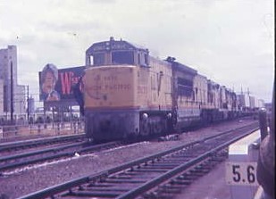 1977 -- Union Pacific DDA35 83, built by Electro-Motive Division in 1965, retired in 1979 and scrapped in 1980, led the livestock express through Walnut, in the eastern part of Los Angeles County, as seen on a bicycle ride from Santa Ana.