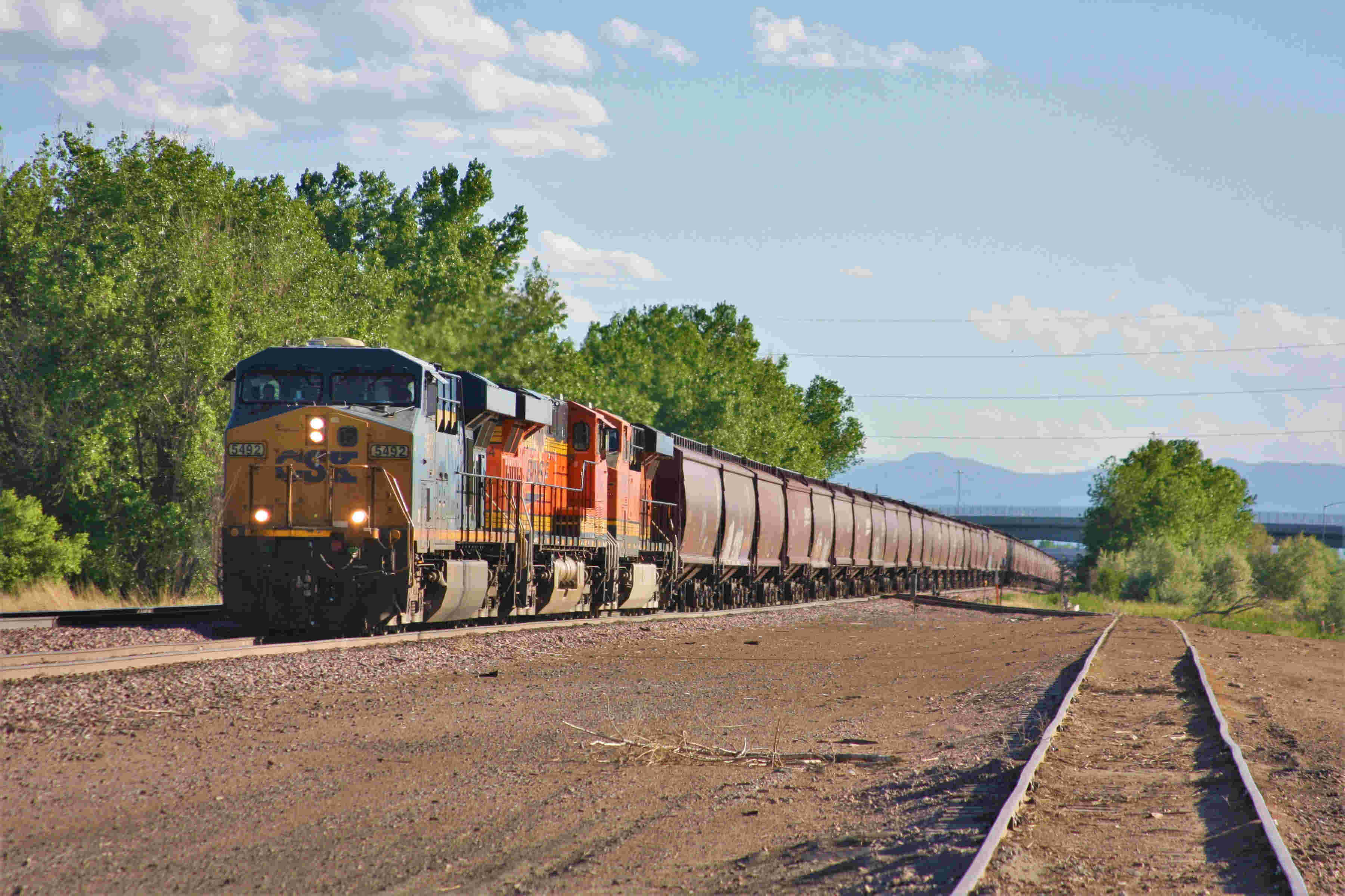 BNSF sand train speeds through the town of Hudson; taken by Ben