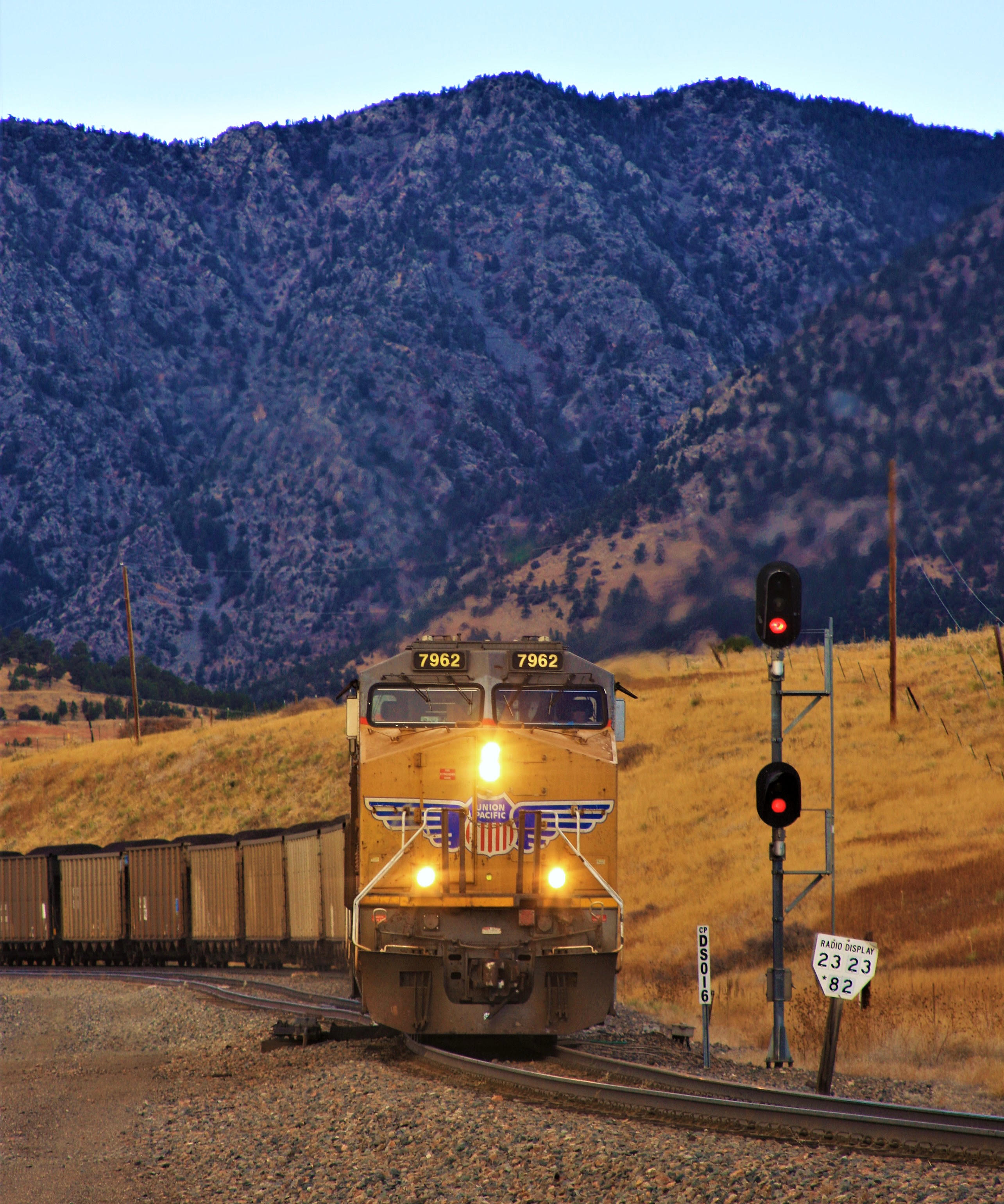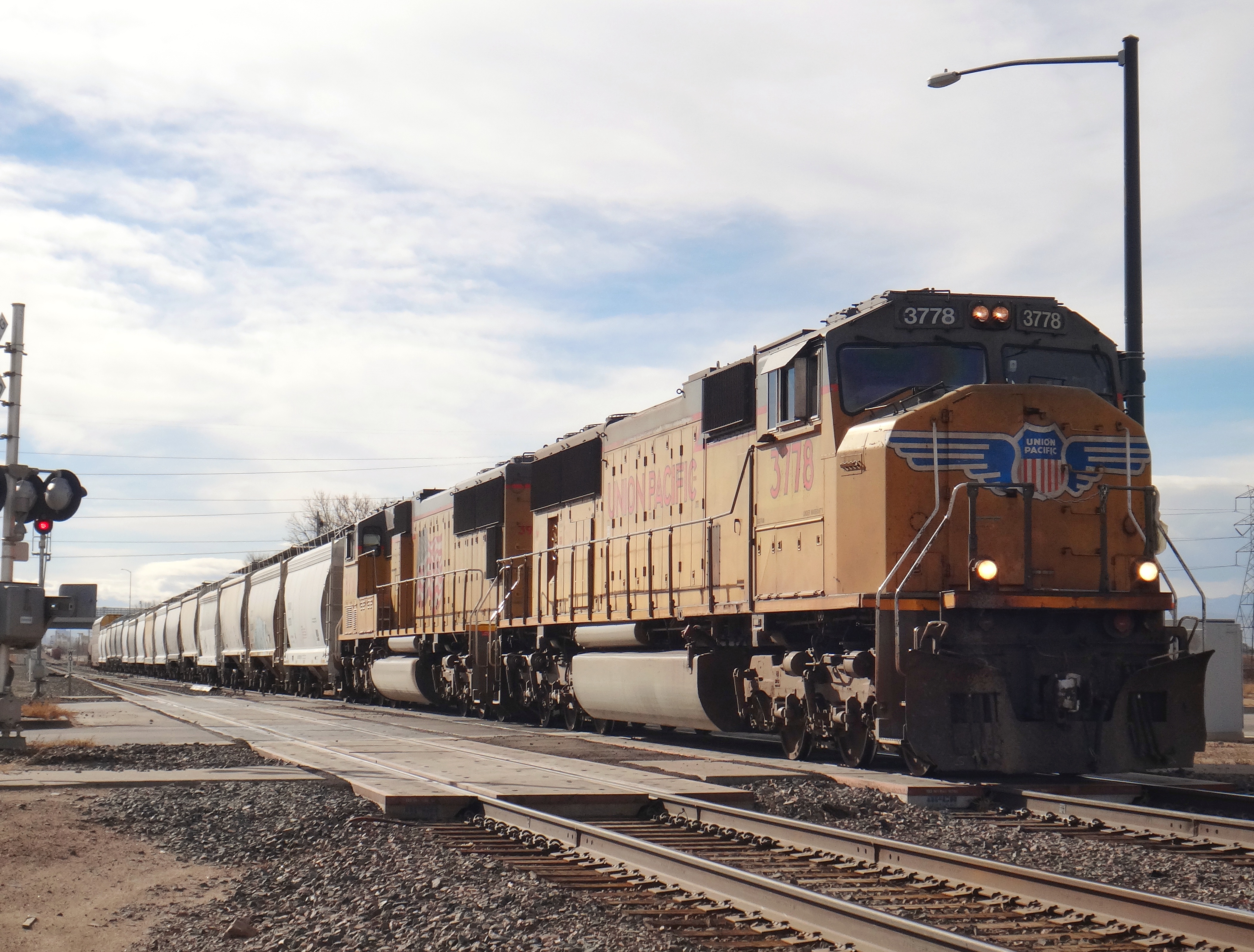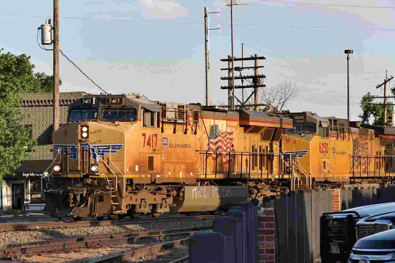 pair of UP GE locomotives lead a manifest through Brighton; taken