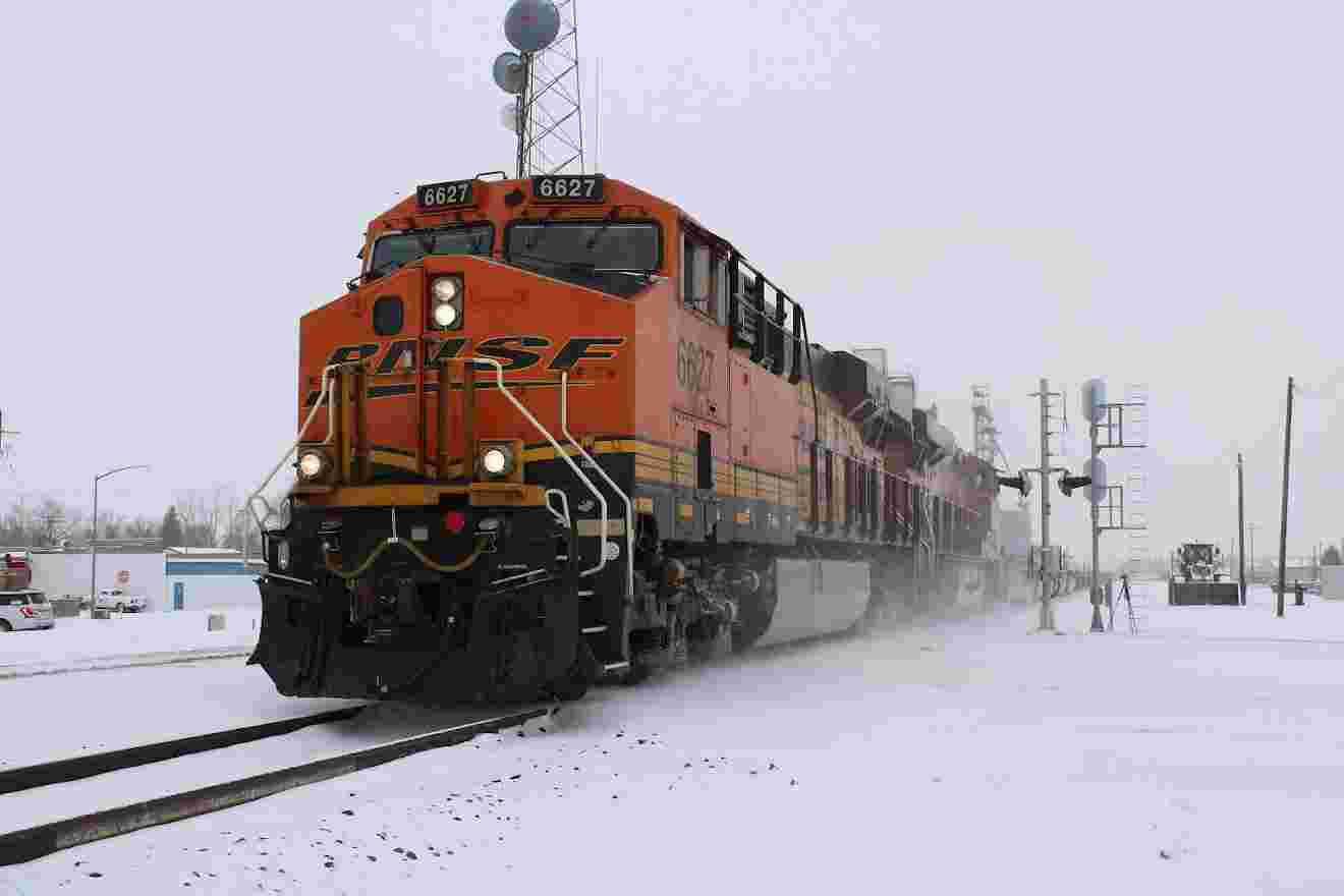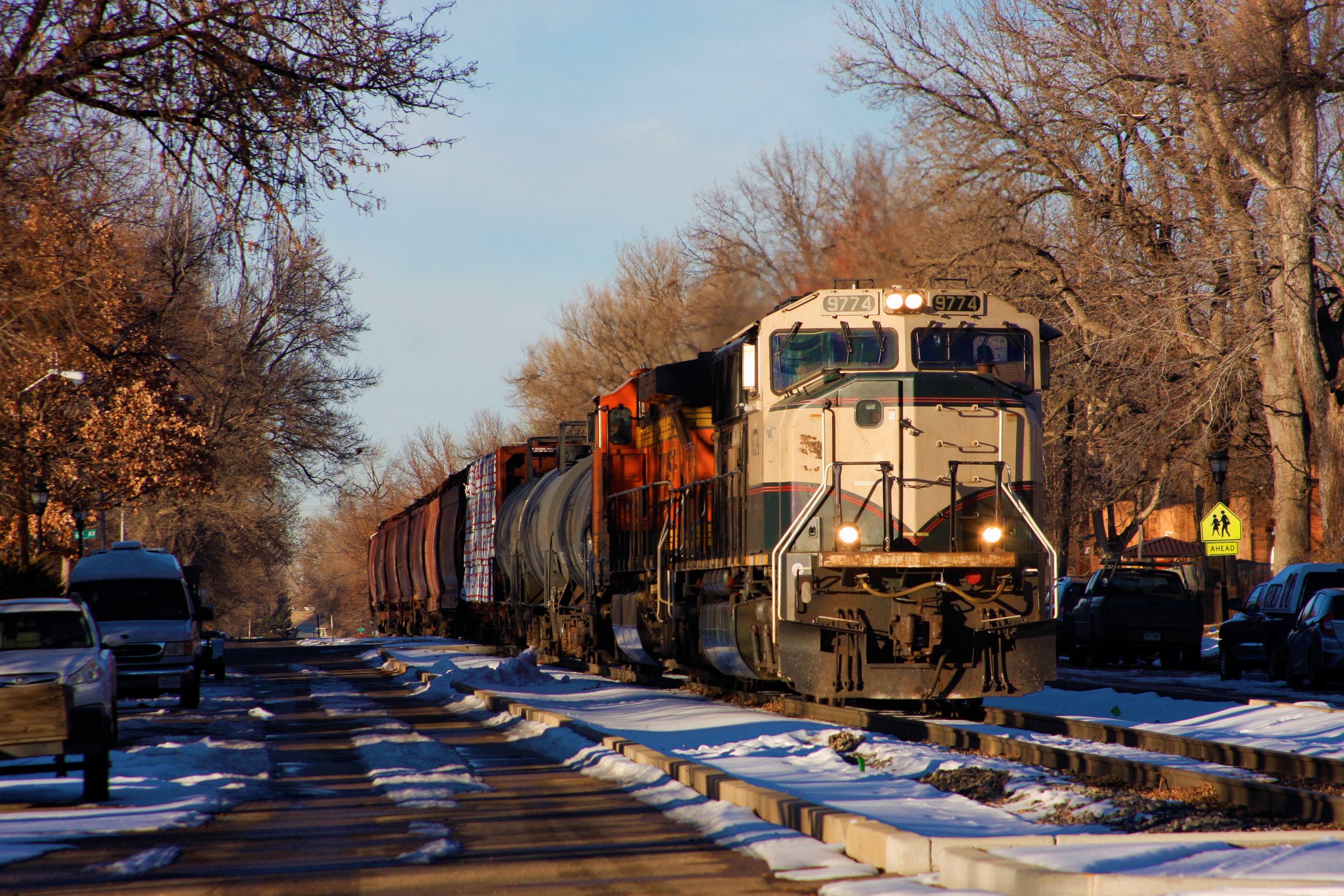 BNSF baretable runs through the snow in Brush, CO; taken by Ben