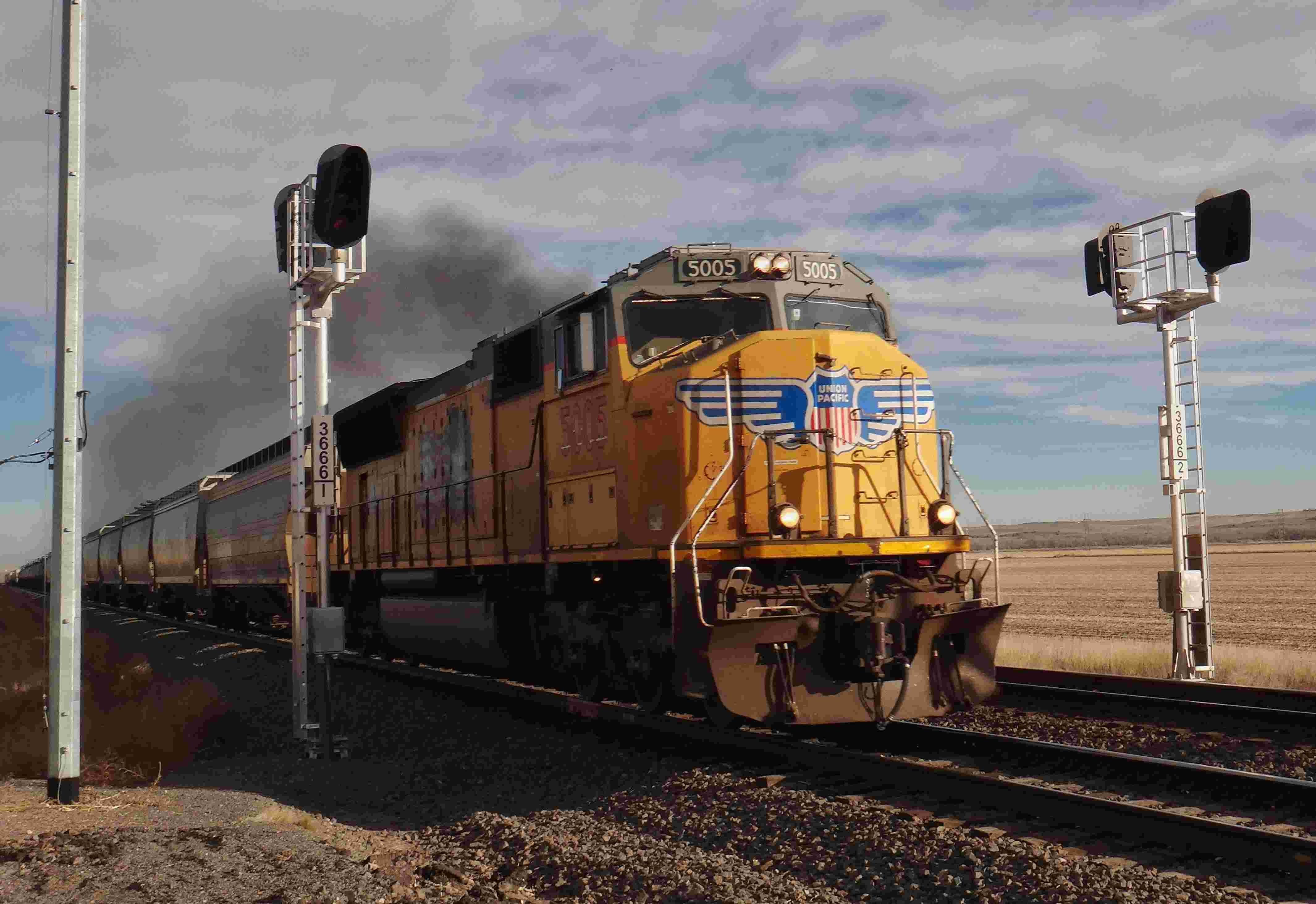 UP coal train heads eastbound at Rocky siding; taken by Andrew H.