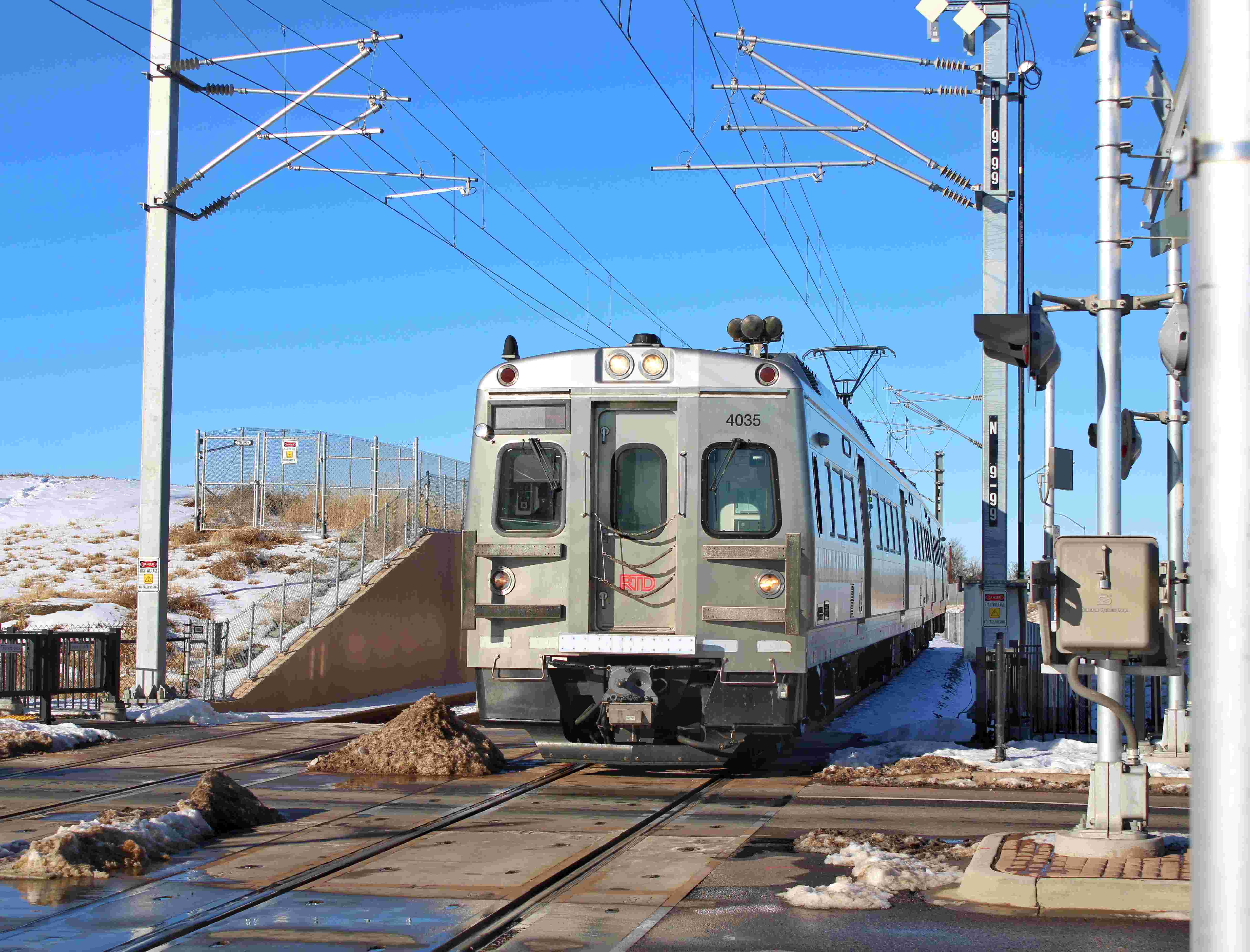 RTD N Line commuter rail slowly crosses 100th Avenue in Thornton;
