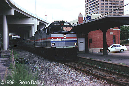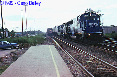 Heading East on the Niagara Branch, is Amtrak Train #64, the New York City bound "Maple Leaf", about to make its regular stop at the Downtown Buffalo Amtrak Station on Exchange Street. Today's train is seen at 1:27pm with F40PH #247 on the lead, for some reason, the Amtrak logo on this unit is painted white instead of black, if anyone knows why, please let me know via E-Mail.