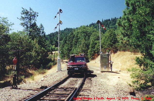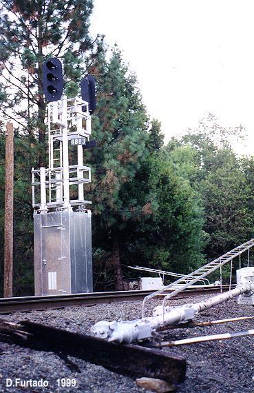 This photo shows the same semaphores when they were still in service. Note the unfinished Electrocode box to the right of the track. The double set of blades to the left are the same signal as the one pictured in the last photo, lower right in photo. Photo courtesy of Larry Tuttle and appears on Alpha Rail Pages. Larry has a play by play of these semaphores being removed on his site. Check it out! |