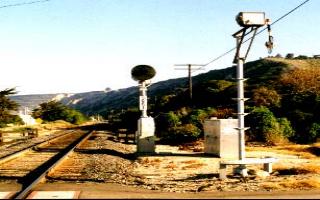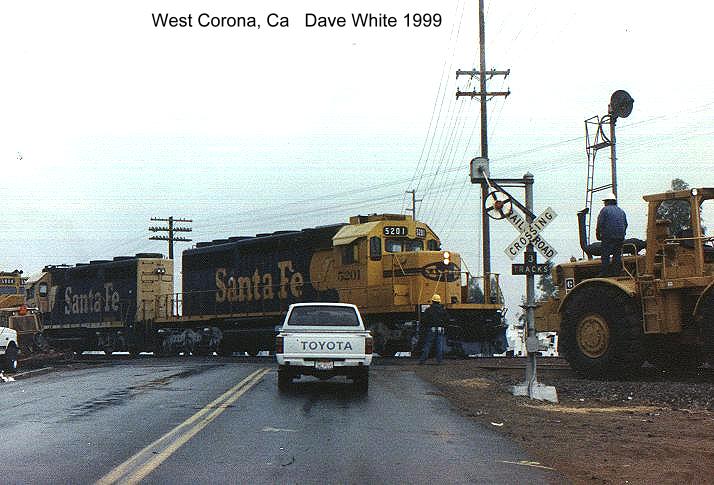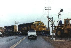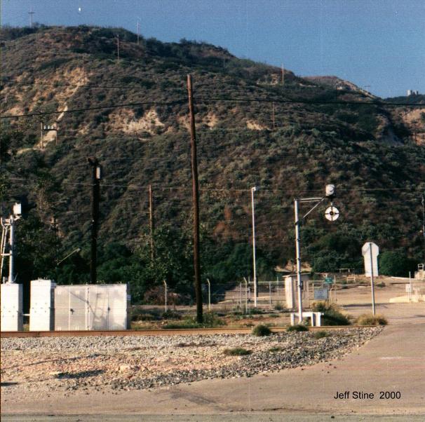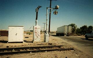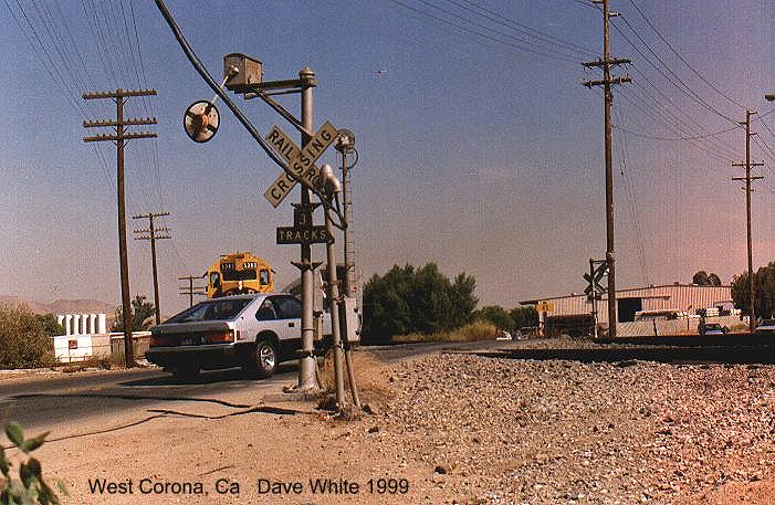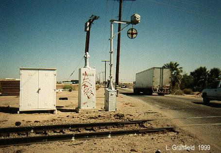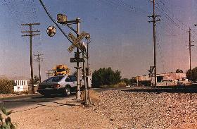 The picture on the right was taken in March of 1991 and the wigwags only had a few more weeks of service left. The whole San Bernardino Subdivision was being upgraded and double-tracked in anticipation of Metrolink and increased freight traffic.Construction was going hot and heavy here and the train seen in this shot is passing the work crew at restricted speed. The next time I was by there, sometime in April of '91, the 'wags were gone and replaced by cantilevered flashers and gates. Where they wound up or who got them is anyone's guess---maybe you know? |