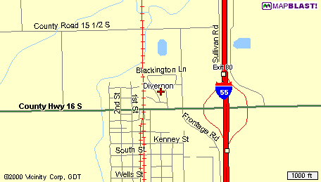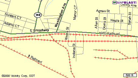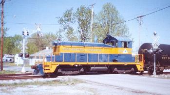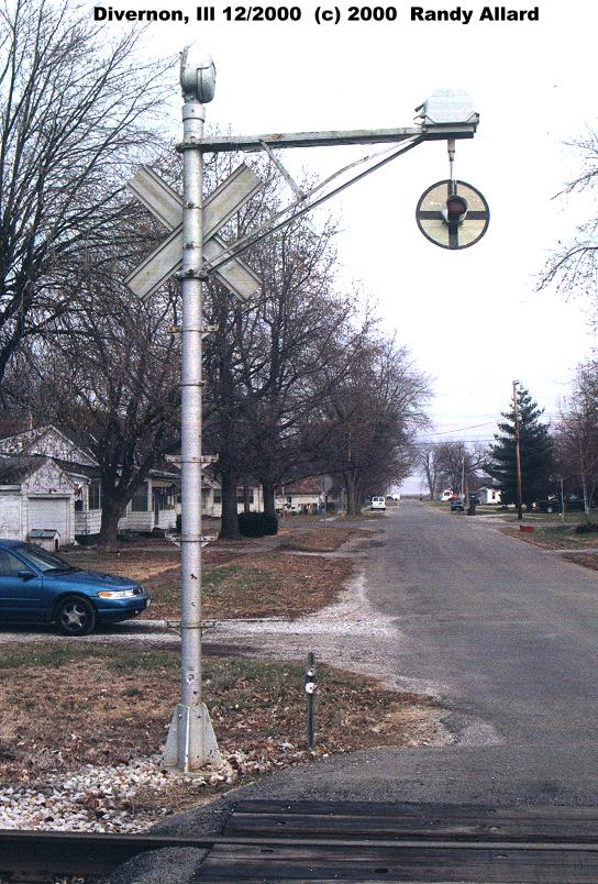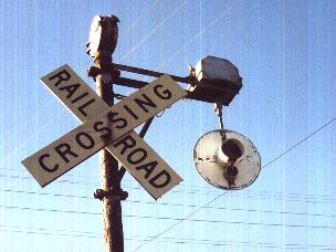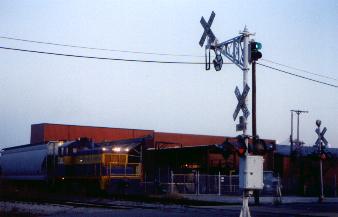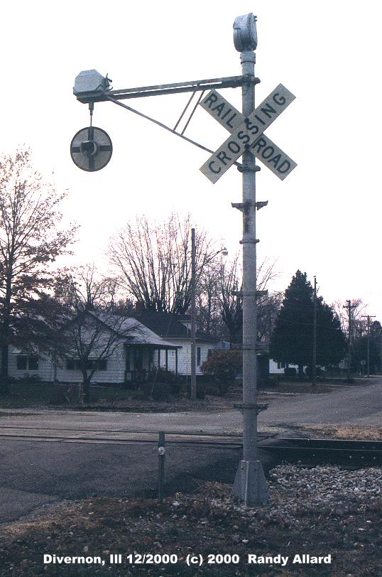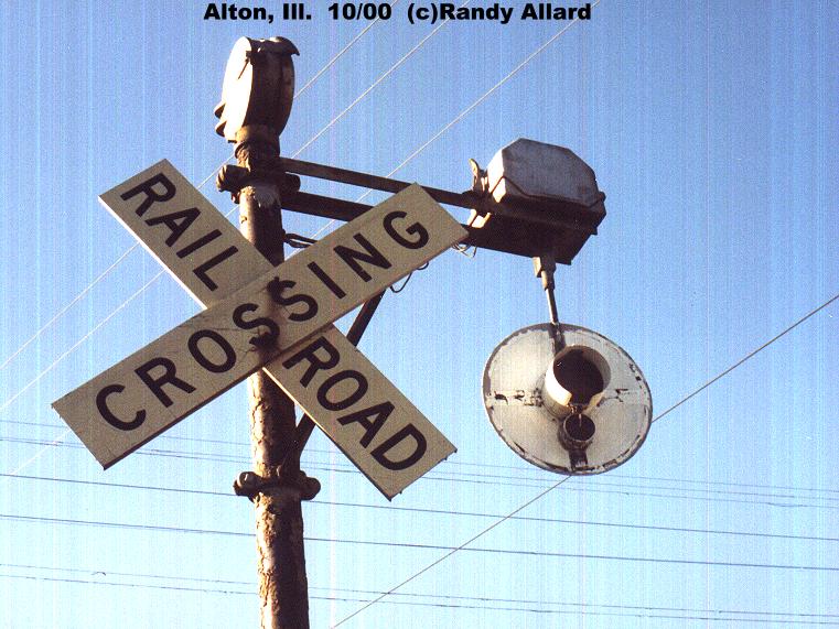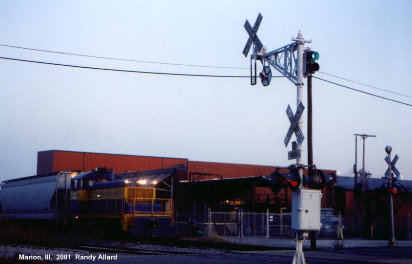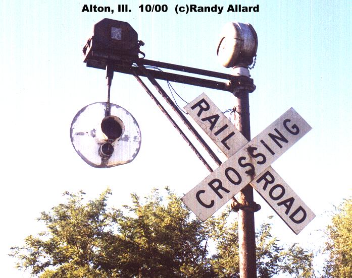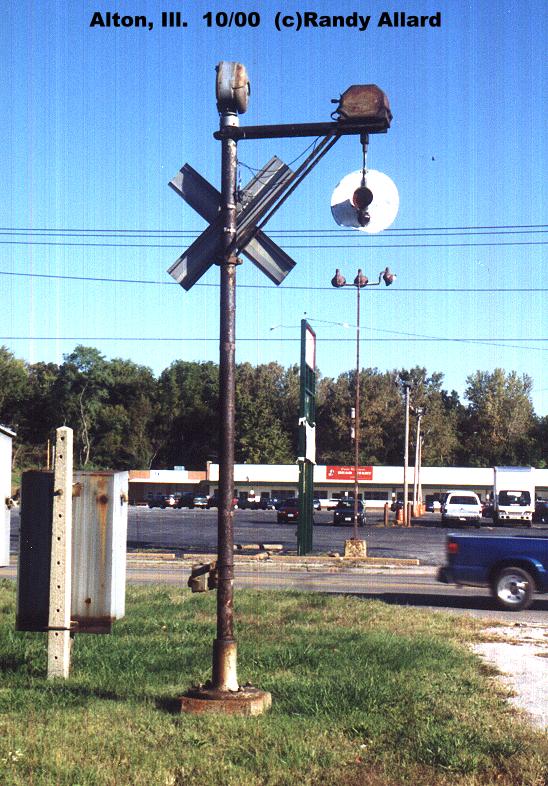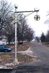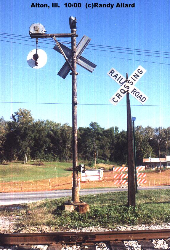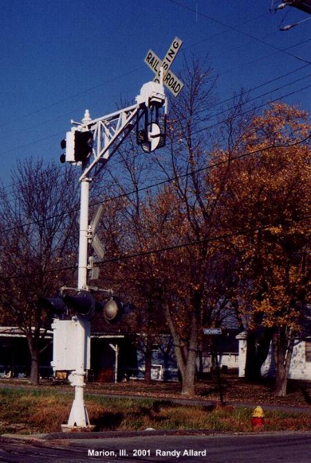 | A very unique wigwag is in service at the Crab Orchard and Egyptian Railroad in Marion, Illinois. It is located at the North Fourth Street crossing. This is a WRRS wigwag on a very modern cantilever that also sports a set of flashers and a 2 color light signal. Also note the interesting rock guard. According to Randy Allard, this signal has been moved at least once and may be moved again. He also mentions that several other types of antique signals are in use on this line. |