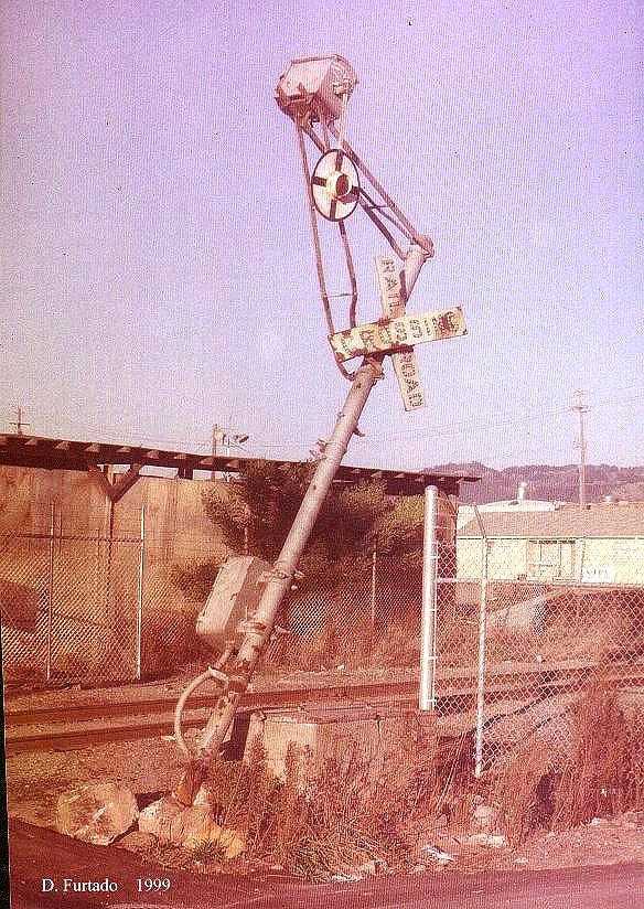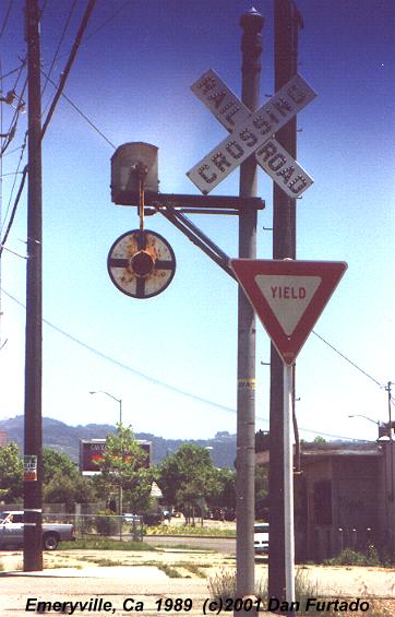 | It wasn't until the late 80's that I discovered the Santa Fe "Backyard Line" that ran from Richmond to Oakland (Emeryville). Up until 1990, many of the wigwags were still in place, though the line had been severed from Richmond during the early '80's (after abandonment in 1979). Below are the only photos that I took of these wigwags, which numbered over 15 in 1990. The Niles Canyon Railway (Pacific Locomotive Association) acquired them that year and placed a few in Niles Canyon. See museum page. |