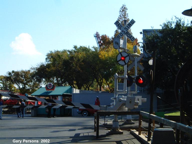 | A rather unique signal display can be seen at the Six Flags over Texas park in Arlington. They have 2 wigwags at 2 crossings, mixed with WRRS Model 10 crossing gates. The crossing gates date back to the 40's, while the wigwags (Magnetic Signal Company) date back to the 20's. Gary Persons (Lead Electronics Technician) says that they rarely have problems with this arrangement. |