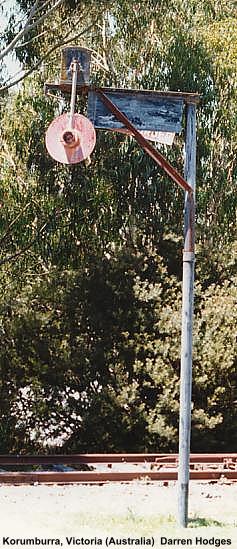 In his own words... "I finally went and got myself a scanner. So I can make a start on my own sign and signal site. In the meantime, here's one wigwag photo that I've come across so far. It is in a folk museum called Coal Creek Heritage Park in Korumburra, Victoria. This and one other (in better condition) in a railway museum are the only 2 complete examples to have survived into preservation as far as I know. I have a photo or two of the other...somewhere." "There is a drop down banner that reads "out of order" just visible under the black boards behind the angled support bracket. I'm not sure if these automatically appeared when the signal was faulty or they were put down manually until a repairman could be arranged. All photos I've seen of VR (Victorian Railways) wig wags had these banners." "I took the photo about 5 or 6 years ago. I'll send others when I come to them." We'll add a link to his site when it's up. |