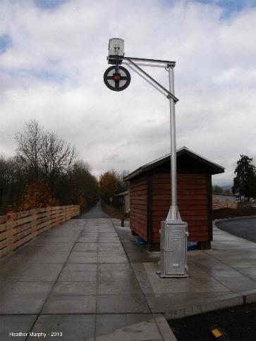 | In early 2010, ODOT Rail, Washington County, the City of Banks and the Oregon Parks and Recreation Dept completed a long anticipated project to re-align Sellers Rd. This eliminated the rail crossing at Sellers Rd. and provided a spot to build the new trailhead and provide parking. The wigwag was carefully restored by Michael Garrison, including the scratch-built banner that was on the signal during its last few years in service. There are plans to replace it with a proper banner as soon as it is built. Stay tuned... |