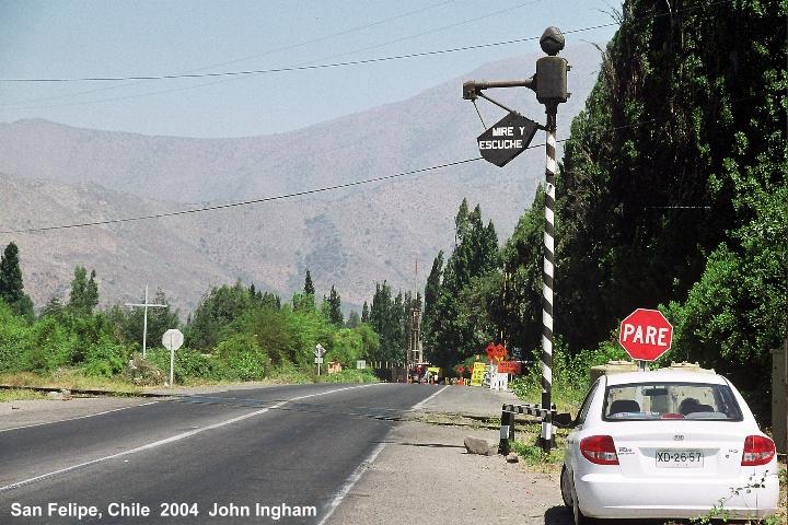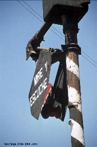 | "This is wig wag is still in operation at San Bernardo (18 kmk or 10 miles South of the capital Santiago). It is the main line to the south of Chile. The line is double track, electrified and has broad gauge of 1676 mm (or 5´6"). There up to 30 commuter and 10 long-distance passenger trains a day passing at San Bernardo and about half a dozen freighters. There some more similar level-crossings in Chile where wig-wags are supplementary to manually operated gates as shown in this pictures. If I ever will get another picture or any other information I will send it to you. One country I could believe should also have (or at least in the past) some wig-wags may be Cuba because this railways have been operated mostly under US rules at least untill 1959." |