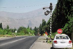 Wigwag on a level (grade) crossing at San Bernardo South of Santiago de Chile, with gates closed.