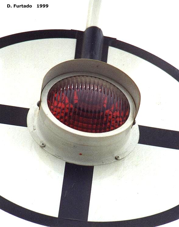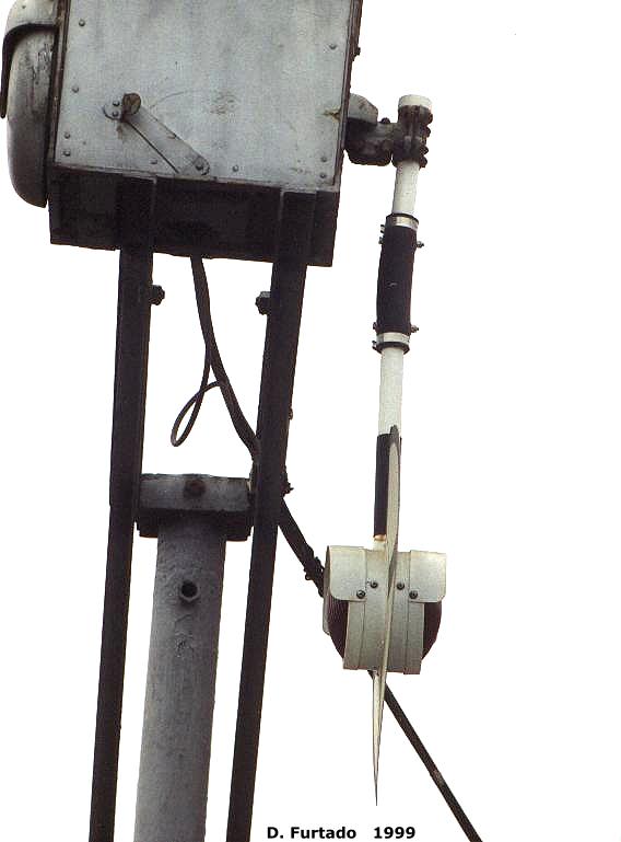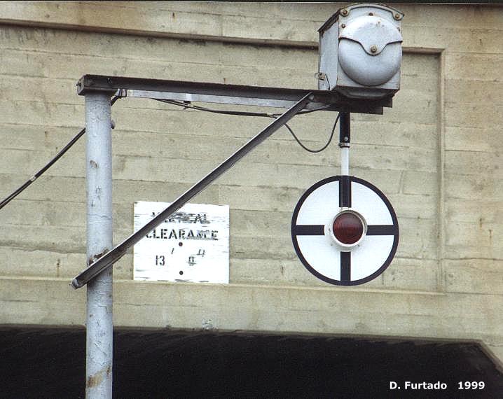 | On August 24th, 1999 I decided to take a trip out to Martinez and get some detail shots of the Martinez wigwag, since this is the last lower quadrant SP wigwag left in the SF Bay Area (excluding museums and Santa Cruz/Watsonville). I got some close ups of the reproduction banner. They are quite different from the original ones. Notice Martinez/Benicia Bridge in background of first picture (through tunnel). |