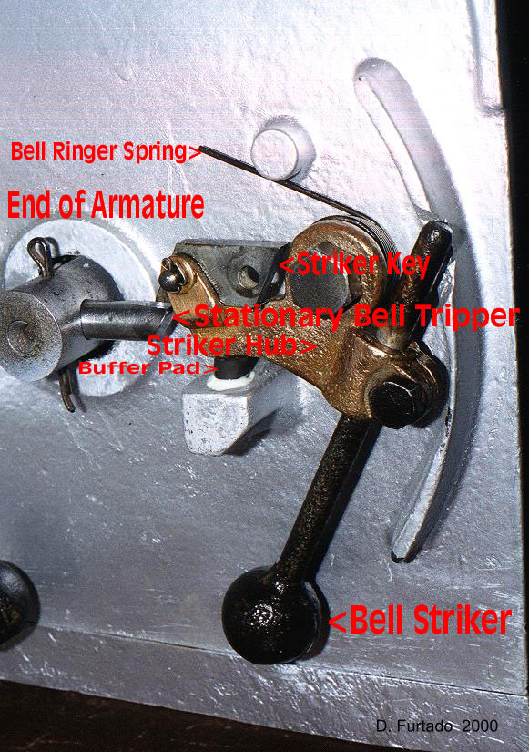 The bell housing is held to the wigwag motor box with three bolts. After removing the housing, this is what you will find. Starting from the center is the "end of flagman armature". The stationary bell tripper is held in place with a cotter pin. (The tips of the bell tripper may become worn, and will eventually fail to trip the striker key) As the armature rotates, the bell tripper pushes the striker key up. When the armature is at the end of it's swinging cycle, it lets go of the key. This causes the striker assembly to drop, which causes the hammer to hit the gong. This happens on each swing of the armature, causing the bell to ring one time in each direction. |