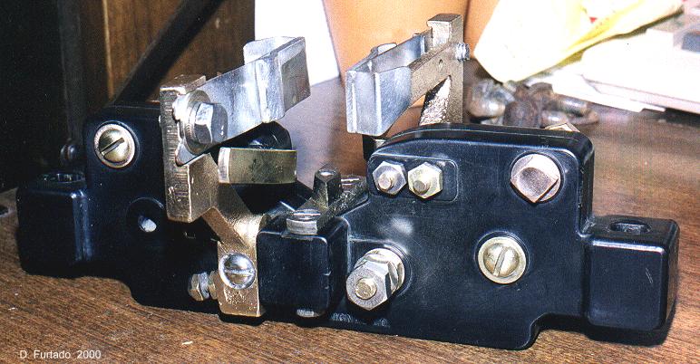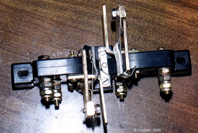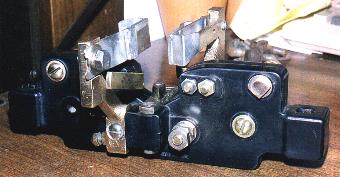 | This is the heart of the wigwag motor electrical system. (Along with the movable finger contact) The photo on the left shows an overview of the terminal board. In the very center is the diamond. This is the part that directs the movable finger as it brushes past the contacts. This is one of the few parts that need to be greased. The photo to the right shows the two contacts. These need to be kept free of rust, dirt and grease. Each contact is connected to one set of magnets. When the movable finger brushes across one contact, it energizes one set of magnets and pulls the armature to that side. As the finger moves past the contact, the circuit is opened, and the armature returns. The diamond directs the finger contact to the other contact plate, energizing the other magnet. This is what causes the swinging motion of the wigwag. |