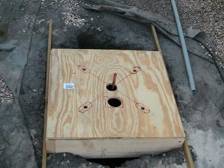 the the center for the ground rod, the conduit opening which is offset on this base, and the 4 anchors. The template fit exactly over the frame so I would be able to center all the anchor bolts. I used 3-foot, 3/4-inch thick threaded rods that I had a welder bend at a 90 angle 8 inches from one end. The conduit came up from behind and into the front hole. |