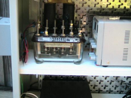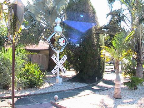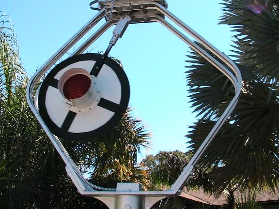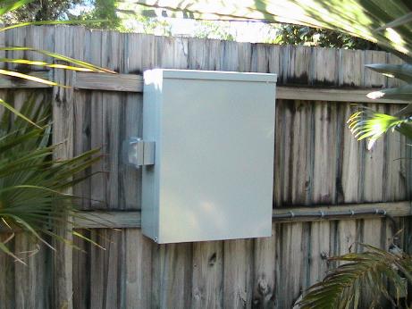 which is the type used for outdoor cable TV wiring centers. The door slides down to open and is held shut by a couple of clevis pins. The various switches are attached to the sides of the box. I designed this so that I could use it for 2 more planned signals in the back yard. Power was supplied from tapping into an outdoor outlet
