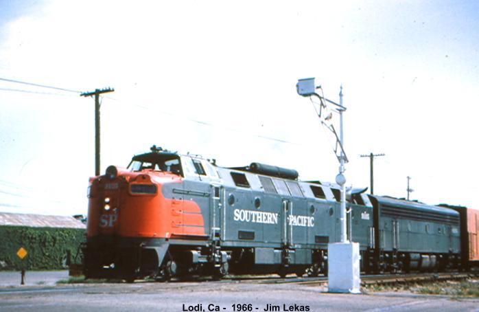 Date: April 4, 1966 Location: Lodi - Oak St. ex-Rio Grande Krauss-Maffei hydro after repaint into SP livery. Trailed by F7B. Crossing has since been closed. |