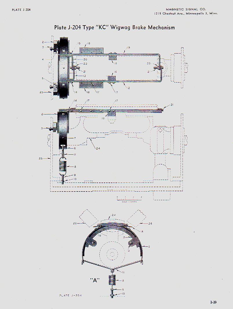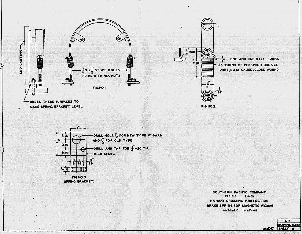 Brake arms (Ref. 19 and 12) are to be adjusted as described in part 6 of the Maintenance Section. If difficulty is experienced in obtaining adjustment check the location of the armature pins (Ref. 21) and the slot in the side of the arma-ture which engages the brake arm support (Ref. 16). The pin should be located in the center of the armature with the center of the pin 5/8" be-low the top of the armature. The top of the slot should be 15/16" below the top of the arma-ture. Brake Springs - (See brake spring plan). Brake springs are to be installed as shown on the brake spring plan. Spring (Fig. 2) is secured to spring bracket (Fig. 3) by means of 1/4" X 2-1/2" stove bolts, the smooth section of the stove bolt providing free escapement for the downward motion of the spring. Spring bracket (Fig. 3) is secured by the existing machine bolts that attach the end casting to the base casting. In some instances it may be necessary to use longer machine bolts to provide a full-length thread for the nut. The top portion of the base on the end casting is usually slightly sloped or may have rough pro-jections that will prevent the spring bracket from extending straight out from the end casting. In these instances it will be necessary to dress the bottom or the o-ring bracket with a file or to chip rough projections from the castings. The spring bracket must be parallel to the base cast-ing and stove bolt must extend straight up and parallel to the end casting. |