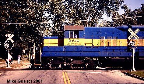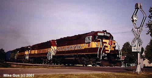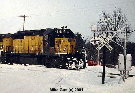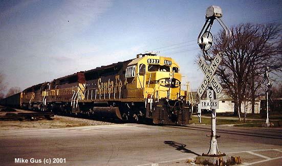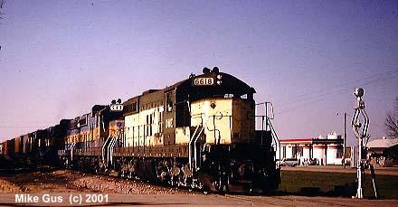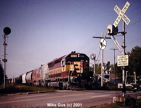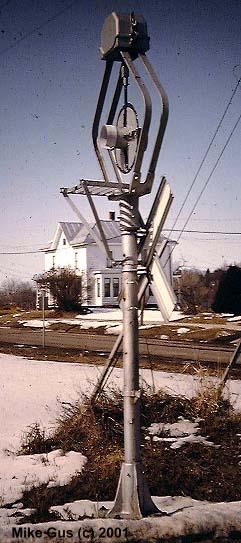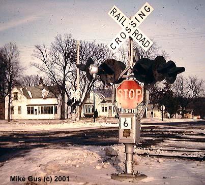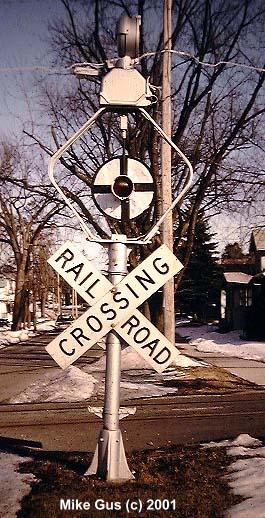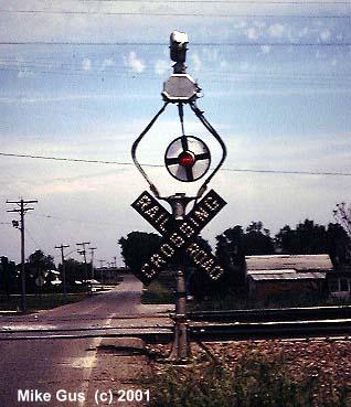 which sort of remained wigwag central until well into the early '90's. As an avid CNW and Wisconsin Central fan, my railfan travels took me into wigwag territory often, but most of the time all I could get were signal-only pictures, savoring the few times where a train would actually appear. I also have a special fondness for Griswold rotating-banner style signals, which are rapidly disappearing from the railroad scene. I am fortunate enough to own one of these relics, complete with a glass reflector "4-Track" sign and glass reflector crossbuck. I am now searching for an original yellow cats-eye stop sign, if you know of one, please let me know! The Griswold is currently "laying in state" in the back yard, but will be resurrected this spring and be standing proud once again. I will try to send pictures documenting the refurbishment of it." -Mike Gus |