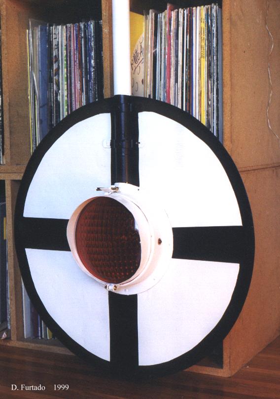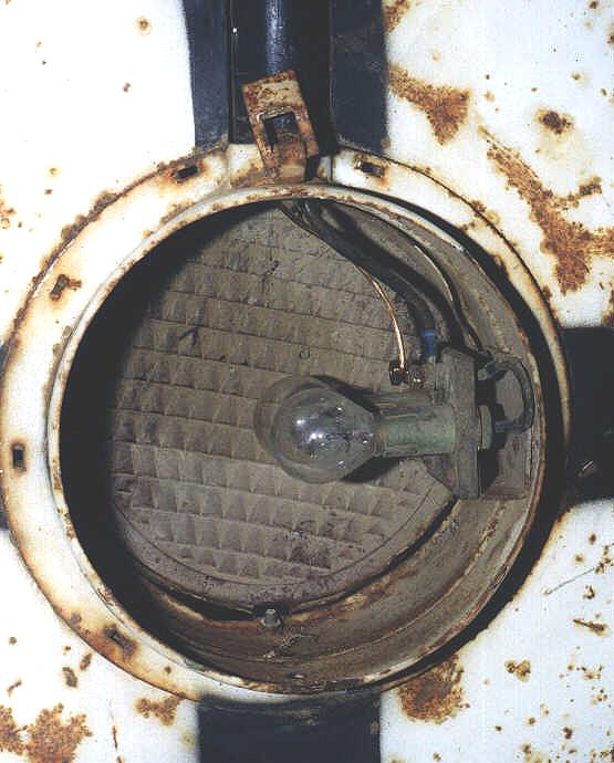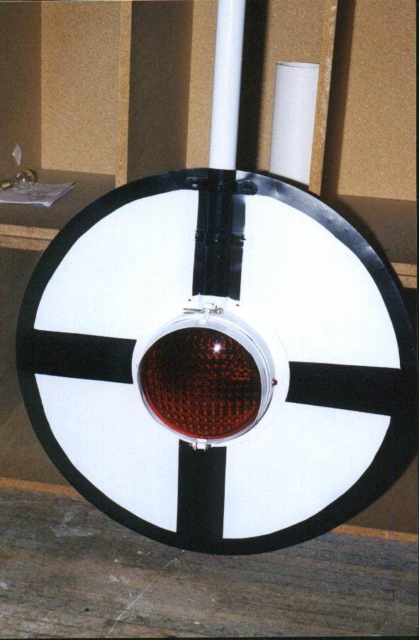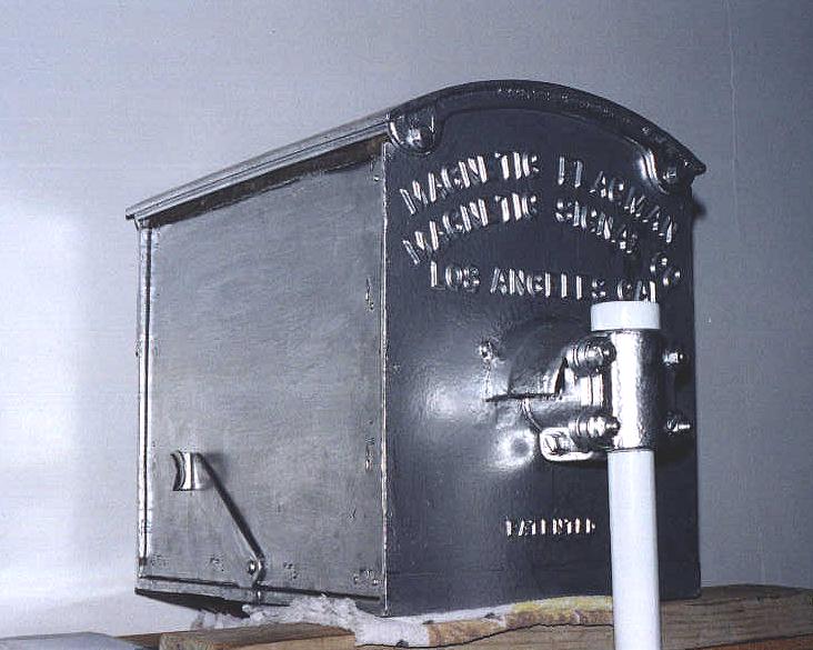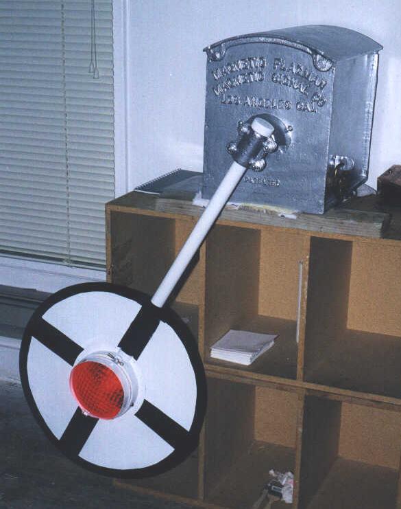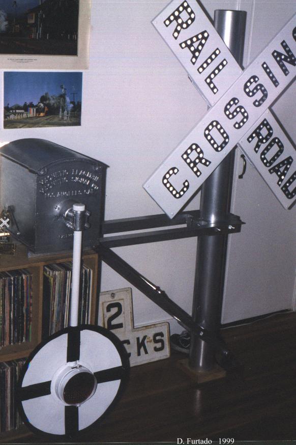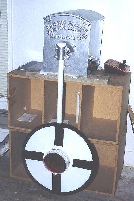 | Basically what I was going after here is the way it looked (upper half of course) when it was in service on the ATSF. Santa Fe set up their wigwags differently than SP (or any other road for that matter). The cantilever and crossbuck came from the same crossing (possibly the same signal) but I purchased them seperately (from the same person). That was another project in itself! From what I understand, Southern California wigwags (on ATSF) were set up similar to this, but with the crossbuck mounted below the cantilever. That would be impossible to display inside a house, so instead I chose to go with the Northern California version. More on specific Magnetic Signal Company wigwags can be found here. |