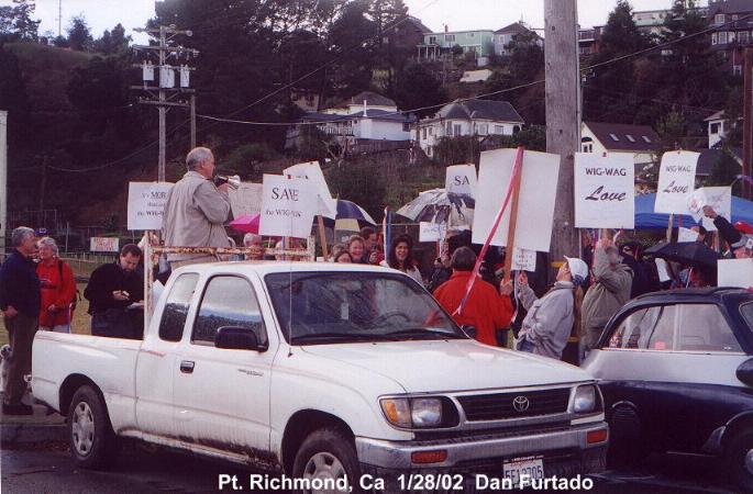 Here's his take on the event: --------------------- The rally got underway around 12:30pm near the West Richmond Ave. crossing protected by the wigwag, on the lawn in front of the Richmond Plunge (a public swimming pool, ironically also endangered). I didn't count, but I'd say over 100 people were there, carrying prepared signs that said things like "We Want Wig Wags" (with the words sharing a common W), "Save Our Wigwags," "Wigwag Love," etc. They had several speakers who spoke to the crowd through a bullhorn from the bed of a pickup, including former Richmond Mayor Rosemary Corbin. The talk was mostly about the good safety record of the crossing (therefore an upgrade isn't necessary for safety reasons), how both trains and cars move slowly through the crossing (therefore...) and how the wigwags are part of the area's image. They even had a "wigwag chant," to be shouted while waving a picture of a wigwag banner over your head: "Burlington Northern Santa Fe - Richmond's wigwags gotta stay!" It remains to be seen whether
