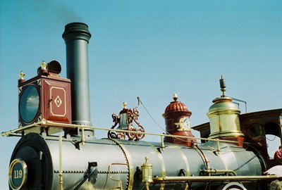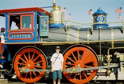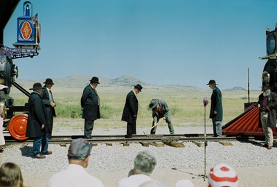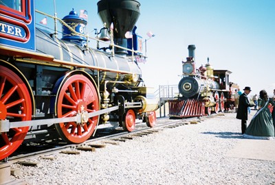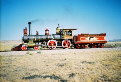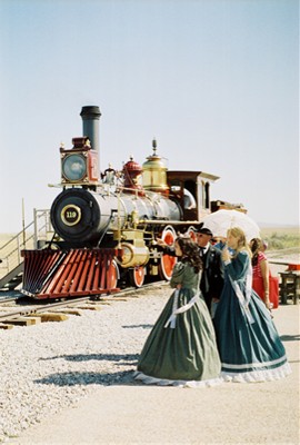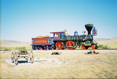 Saturday, after a night sleeping on nice big soft mattresses again, we got up for a huge breakfast at Jeremiah's, and drove north and west around the Great Salt Lake to the Golden Spike Historic Site, near Promontory Point. Today is Railroad Days at Golden Spike Historic Site. We got to participate in the Golden Spike reenactment ceremony, got to ride a handcar pumping with all my might (Alex thought it was going all along pretty easily by itself, without our help, not realizing it was mostly me!) We also got a speeder ride, and climbed through the Jupiter and 119's cabs! The Jupiter's cowcatcher had been removed for repairs, after an early season mishap pulling the trains together a little closer than barely touching. We noted the damage on 119's cowcatcher, which was noticeable if you looked for it.