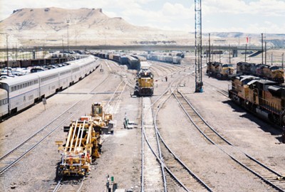 | Standing on the footbridge over the yard in Green River, WY, we watched lots of action! | An Intermodal approaches, and a passenger train on the left. The City of Los Angeles? |