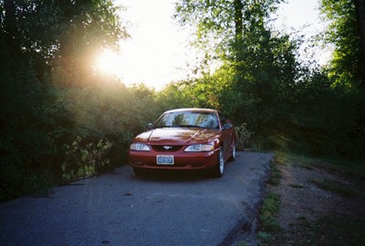 | Alex took this picture of me at our Utah campsite. | Alex wanted to get a shot of the sun going down over the 'Stang. |