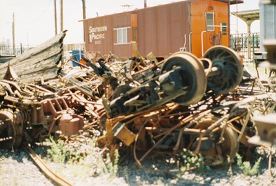 We stopped at Rawlins, Wy, for lunch, and ate our bologna sandwiches in the park next to the Depot, while we watched an intermodal, coal train, and TOFC (Trailer on Flat Car) trains roll through. Some of the trailers were the cheapy Athearn 25' trailers, in Fed-Ex livery. The tie downs were were really fake looking, not as good as the one's in Steve's article in Railroad Model Journal.
