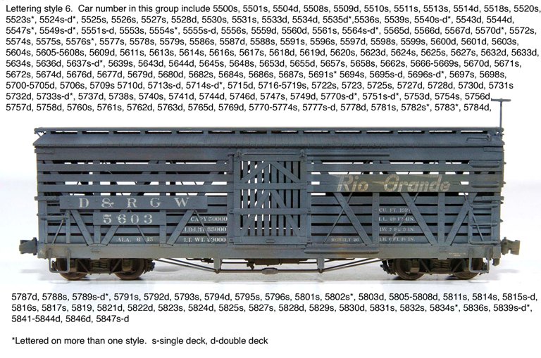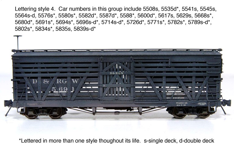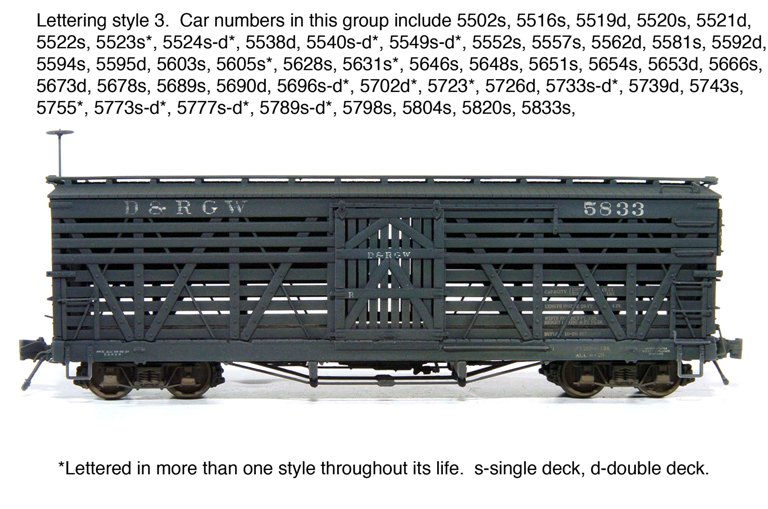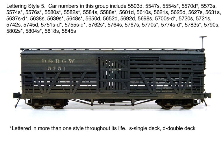 | D&RGW # | Deck | Body Style Letter Style Yr Obs. |