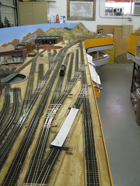 Joe glued-in both of the Monarch switchback extensions and soldered multiple track feeders. The trackage is complete