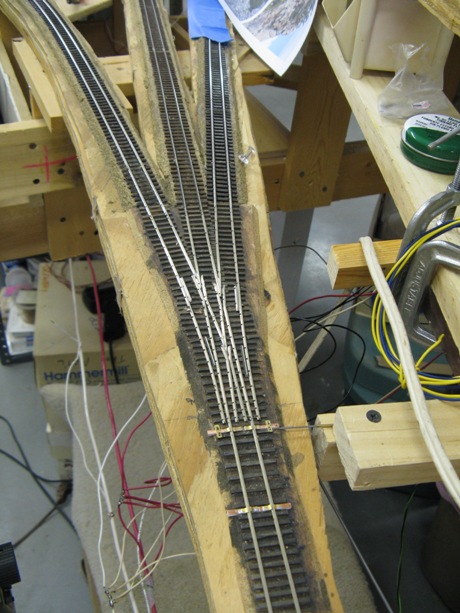 The final DG switch is in process of being spiked down, along with the final rails. Re-wiring of the track