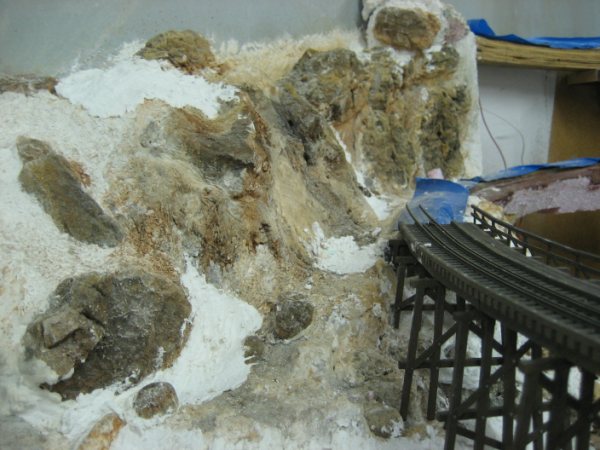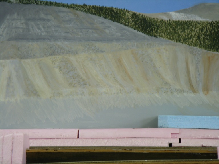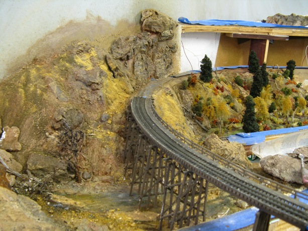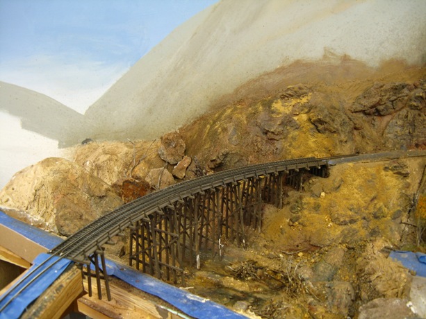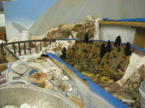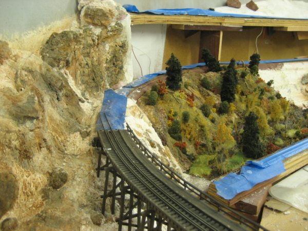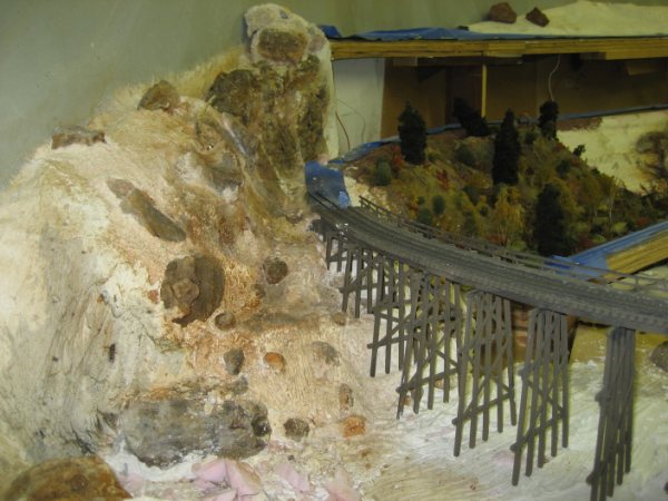Jake added more hydrocal and sculpting to the hill between the trestle and the backdrop, and riverbed base.