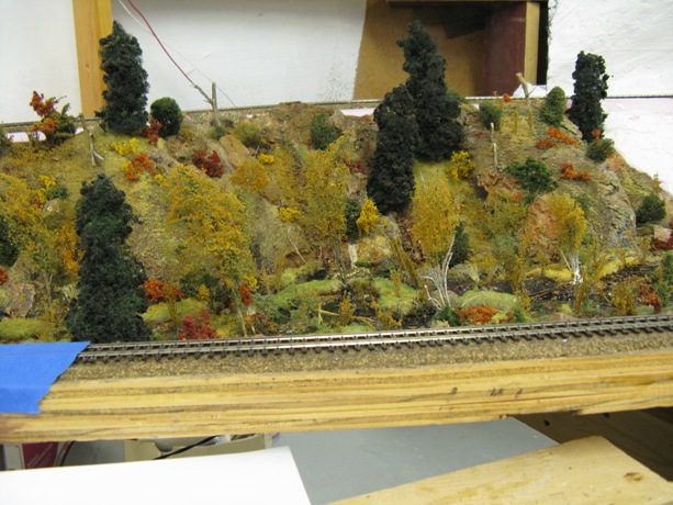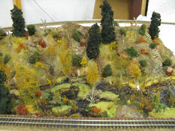 Jake has been busy sculpting the terrain under the trestle and working the landscaping behind the creek.