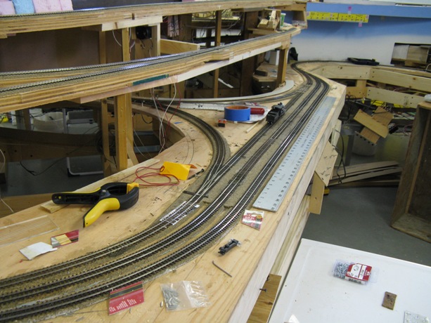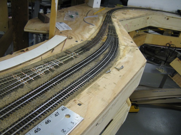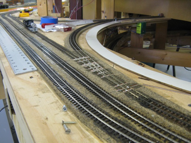 The yard tracks have been laid and now need connections to track power. 1 section of track needs laying on the curve