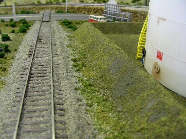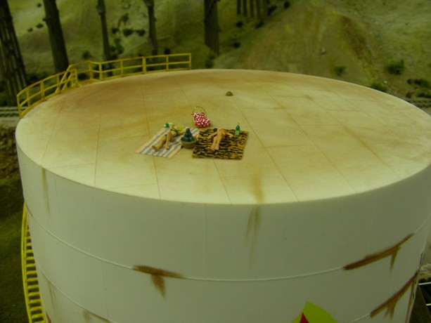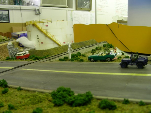 Ground cover/scenery complete, water to be poured. The street has been painted but needs some more weathering. A VW bus & the sunbathers have been procured. Figures will need to be added, and gators scratch made. Also included will be a 1965 Ford Mustang, USAF MP jeep, and Top Secret crate. The LOX tank is simply a Walthers wide storage tank, with steps to the roof. The tank also has installed a battery operating beacon light. All materials and products are being donated.
