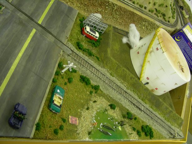 display is approximately 12" x 28", features a straight track with road crossing, Liquid Ox tank, gator pond, USAF