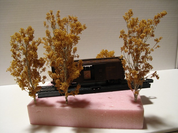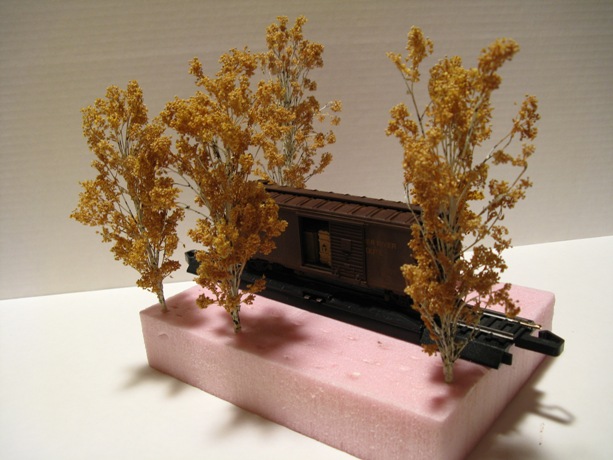 These trees were made from a kit, supergluing individual branches one at a time, to a central floral wire. Caulk was