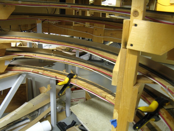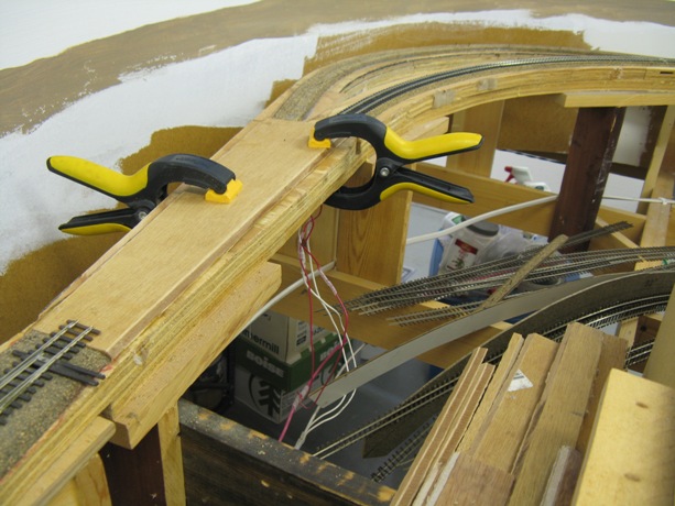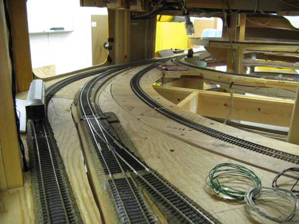 Permanent installation of cutouts set between track and fascia underway. Passing track for 12 car train and house track