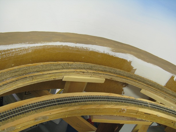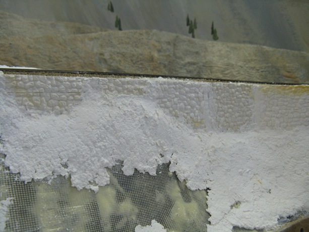 The uneven backdrop behind the Crested Butte site was cut out to allow for scenicing. The ends now need some filler and
