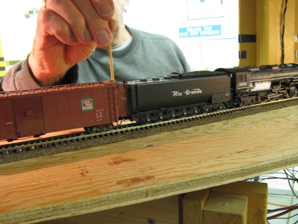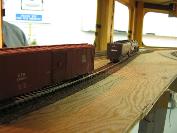 Gerry removed a tight spot on the aisle side siding by cutting the flex track spikes and regluing the rails with CA.